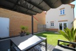 The garden is fully enclosed, offering a lawned area and a cosy decking space with a pergola above, perfect for outdoor relaxation. There is also side access to the driveway through a wooden gate, as well as practical access to the garage via a single door.
